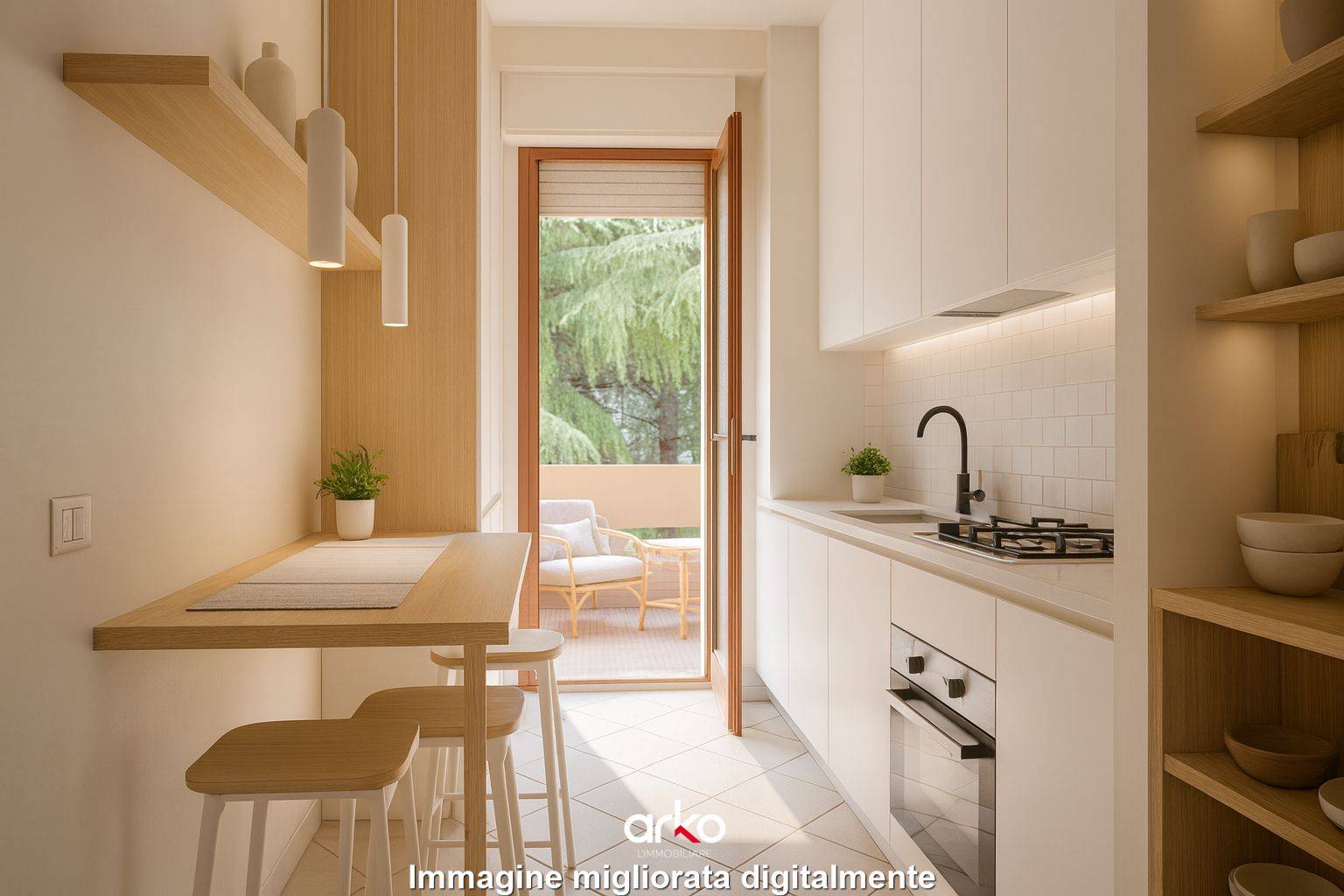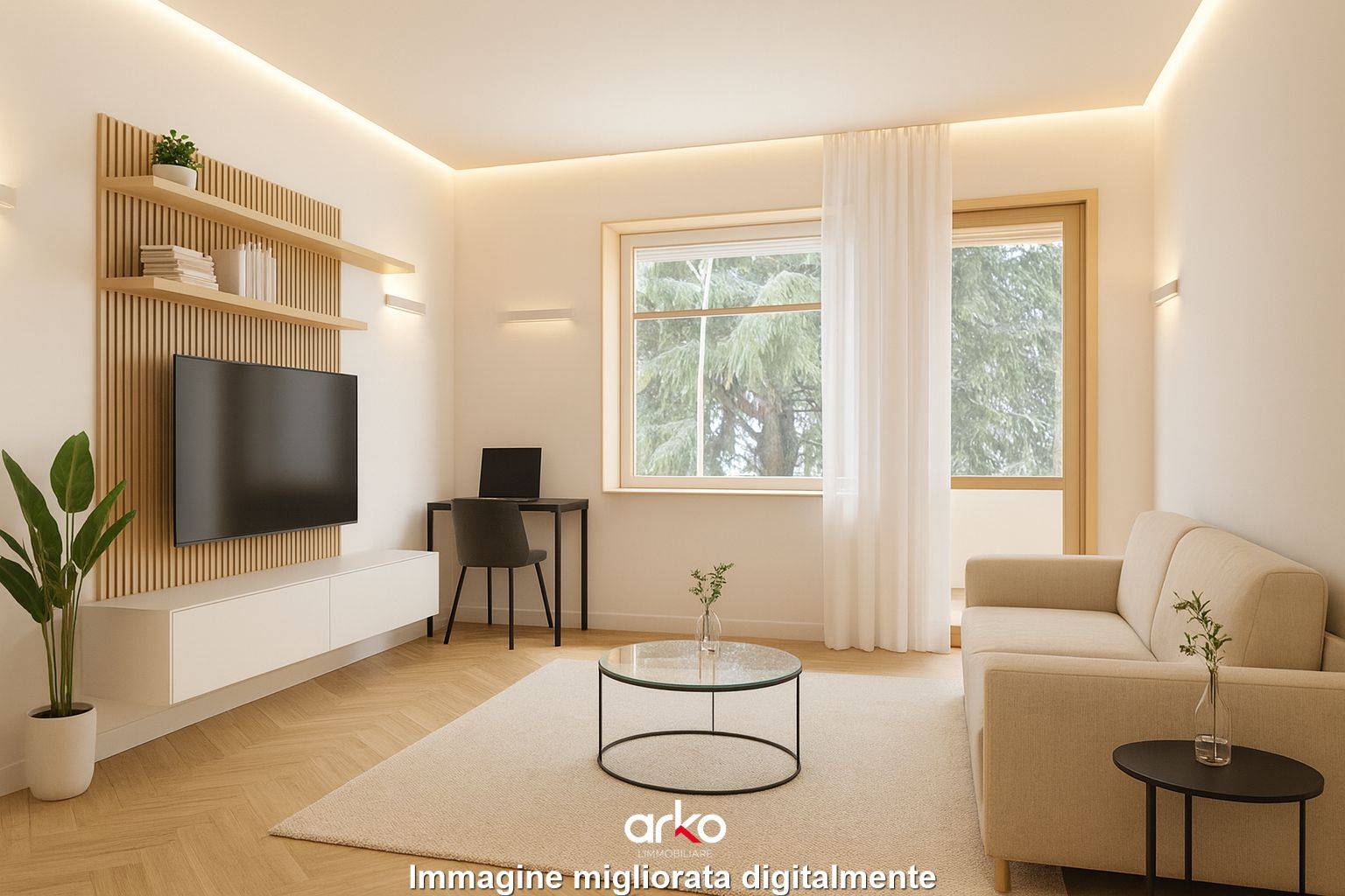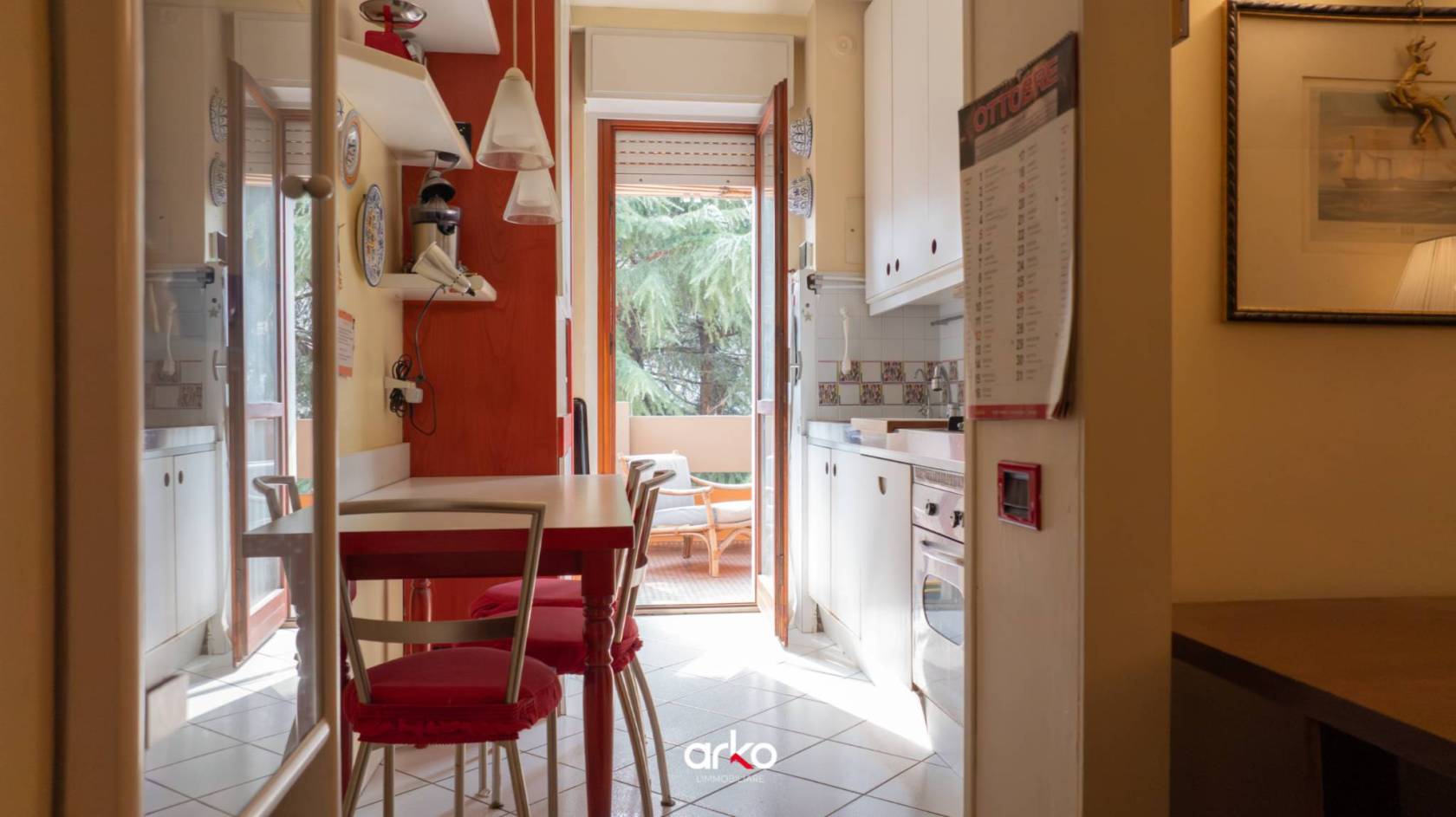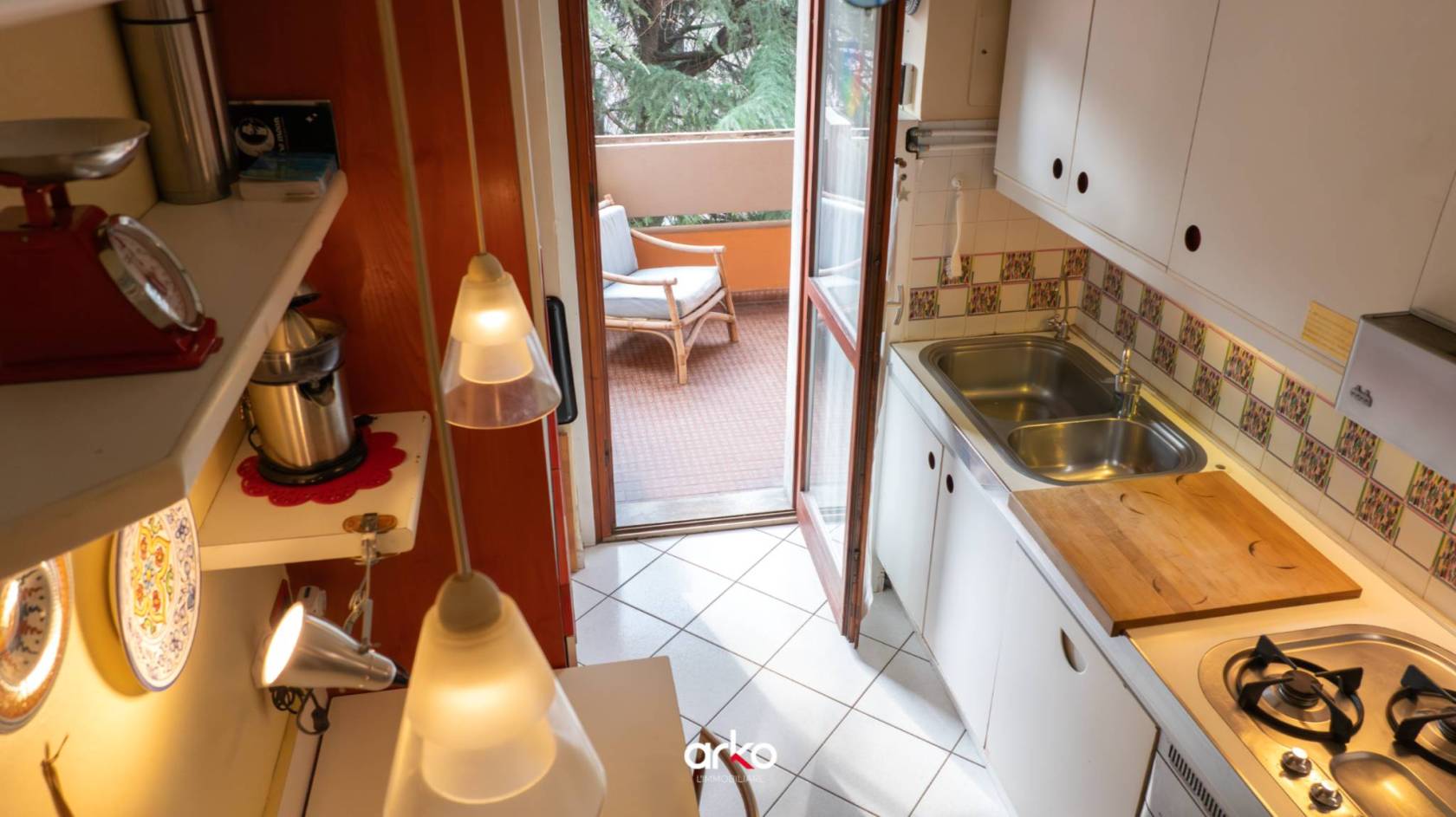 L'abitazione si apre su un soggiorno con affaccio su un terrazzino coperto, condiviso con la cucina, da cui si gode una vista libera e ariosa sul verde circostante.