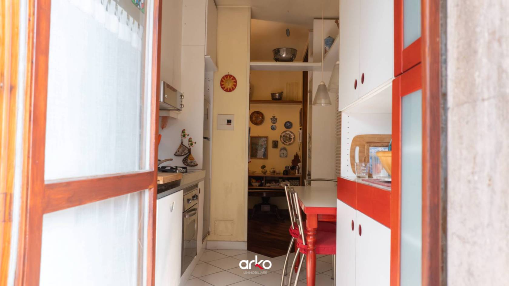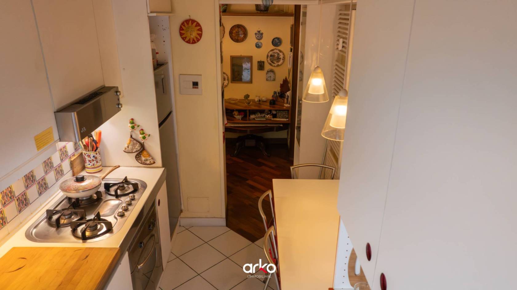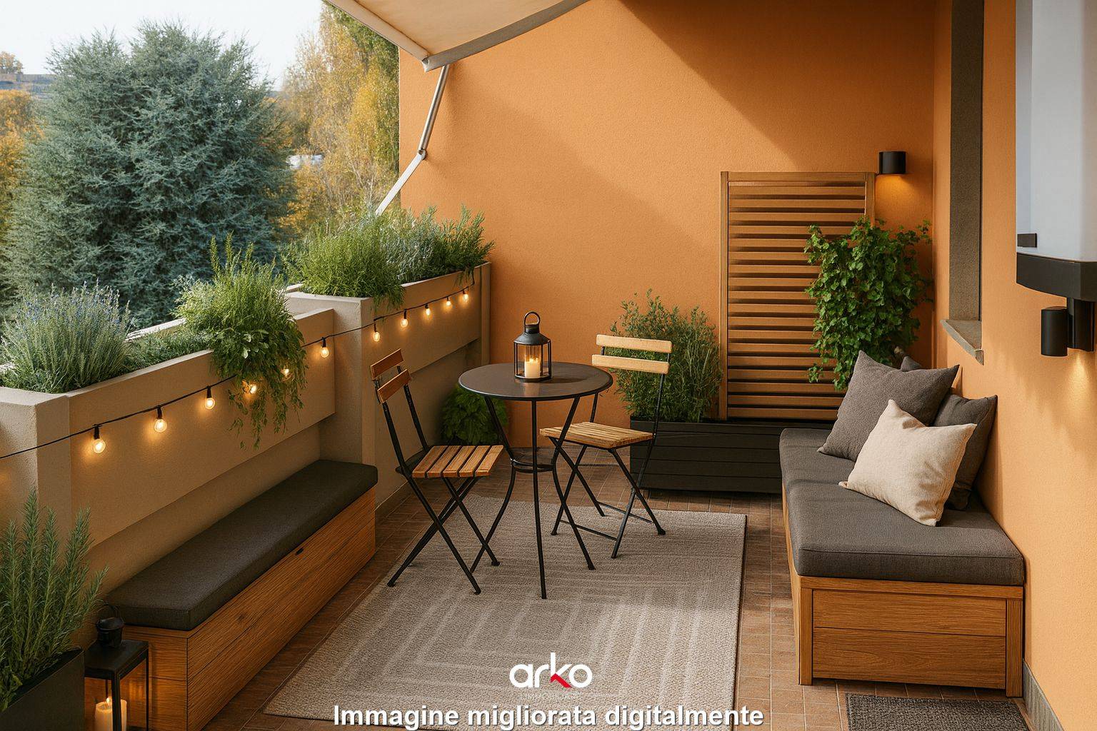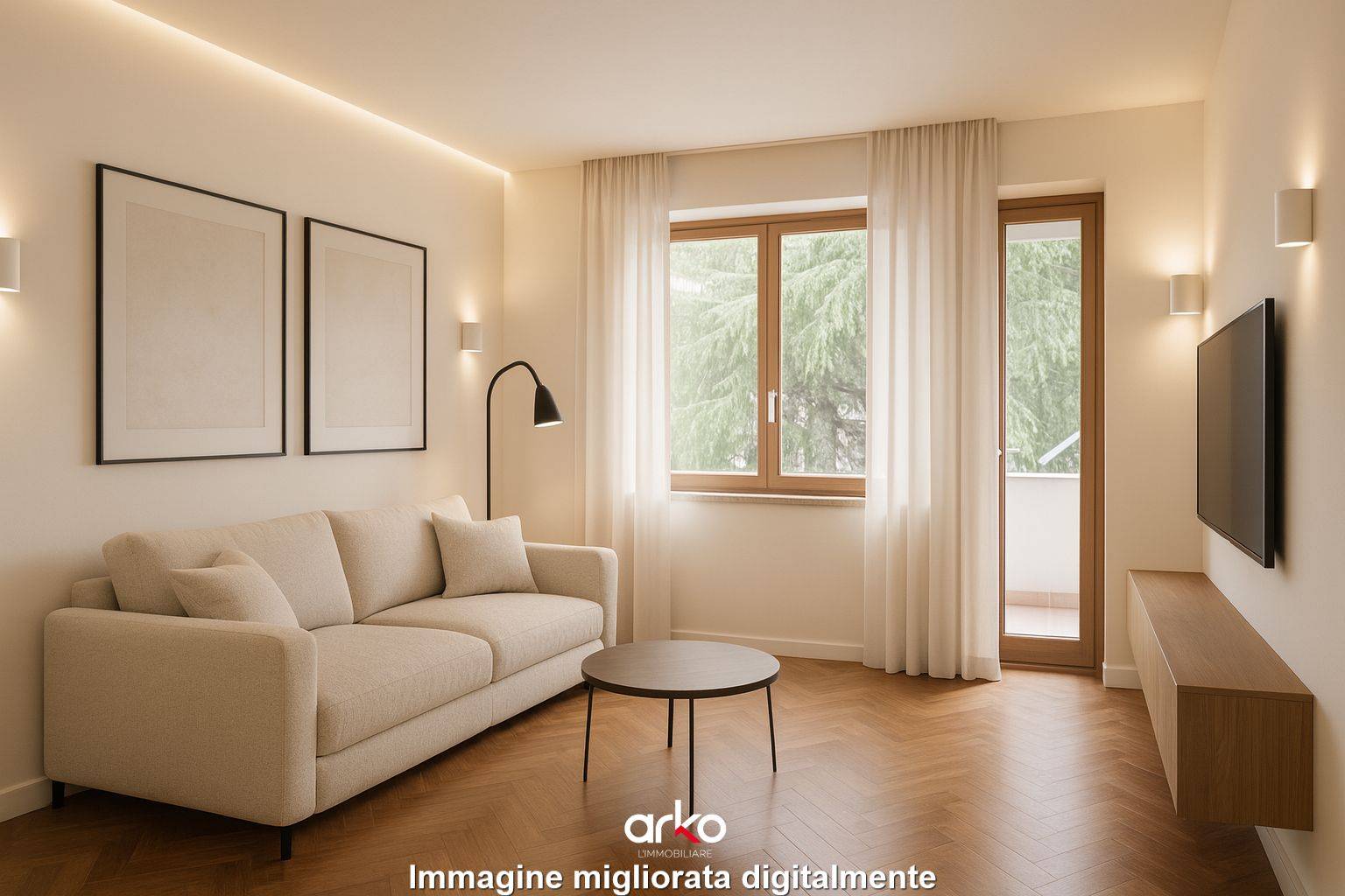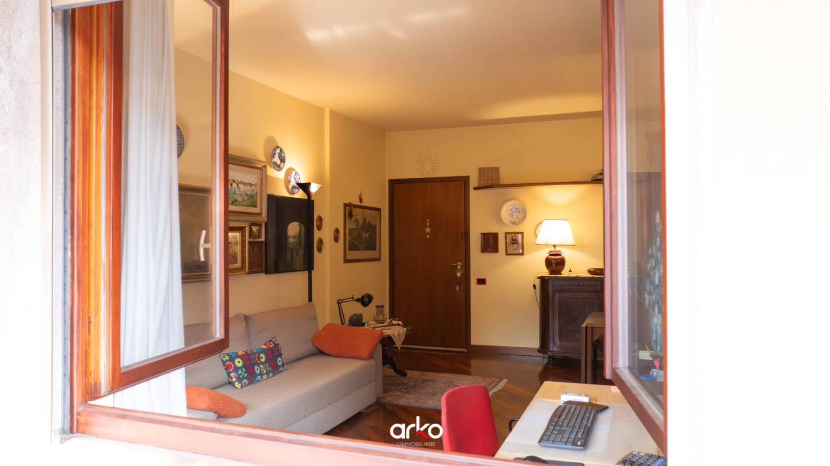 L'abitazione si apre su un soggiorno con affaccio su un terrazzino coperto, condiviso con la cucina, da cui si gode una vista libera e ariosa sul verde circostante.